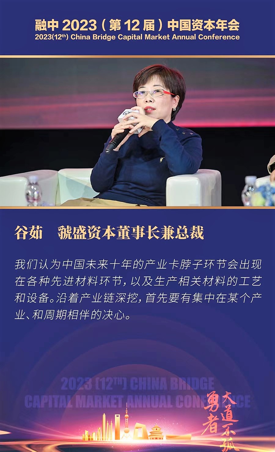 2023年1月10日,上海虢盛資創(chuàng )始合伙人谷茹女士本出席融資中國2023年度資本年會(huì ),在“成長(cháng)期投資專(zhuān)場(chǎng)”與其他投資機構的創(chuàng )始人或合伙人共赴論壇圓桌,談?wù)摬⒎窒?ldquo;如何錨定價(jià)值,助力企業(yè)成長(cháng)”。