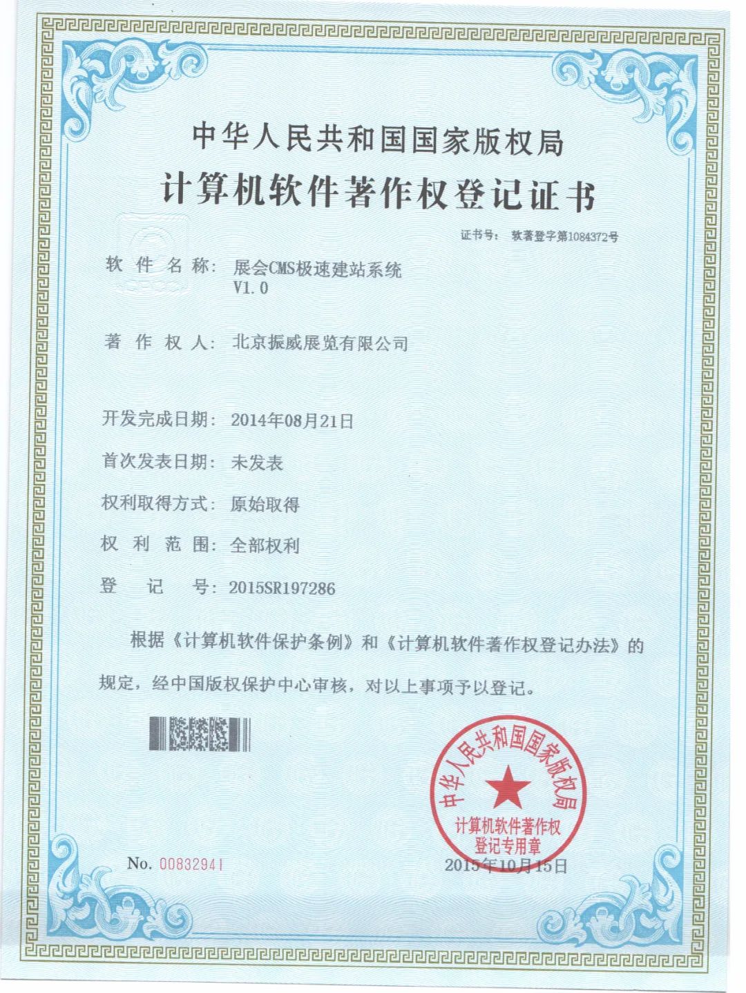 計算機軟件著(zhù)作權登記證書(shū)(展會(huì )CMS極速建站系統V1.0)